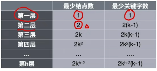 各层结点至少有:第一层:1,第二层:2,第三层: 2 ⌈ m / 2 ⌉ 2\lceil m/2\rceil 2⌈m/2⌉...,第h层: 2 ( ⌈ m / 2 ⌉ ) h − 2 2(\left\lceil m/2 \right\rceil)^{h-2} 2(⌈m/2⌉)h−2个