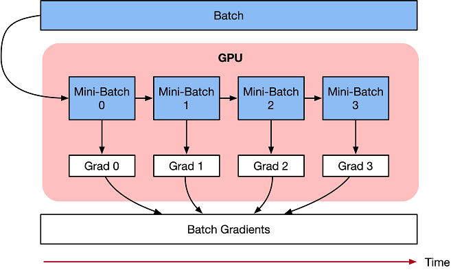 在 N 个 step 内不更新变量,使所有 Mini-Batch 使用相同的模型变量来计算梯度,以确保计算出来得到相同的梯度和权重信息,算法上等价于使用原来没有切分的 Batch Size 大小一样。