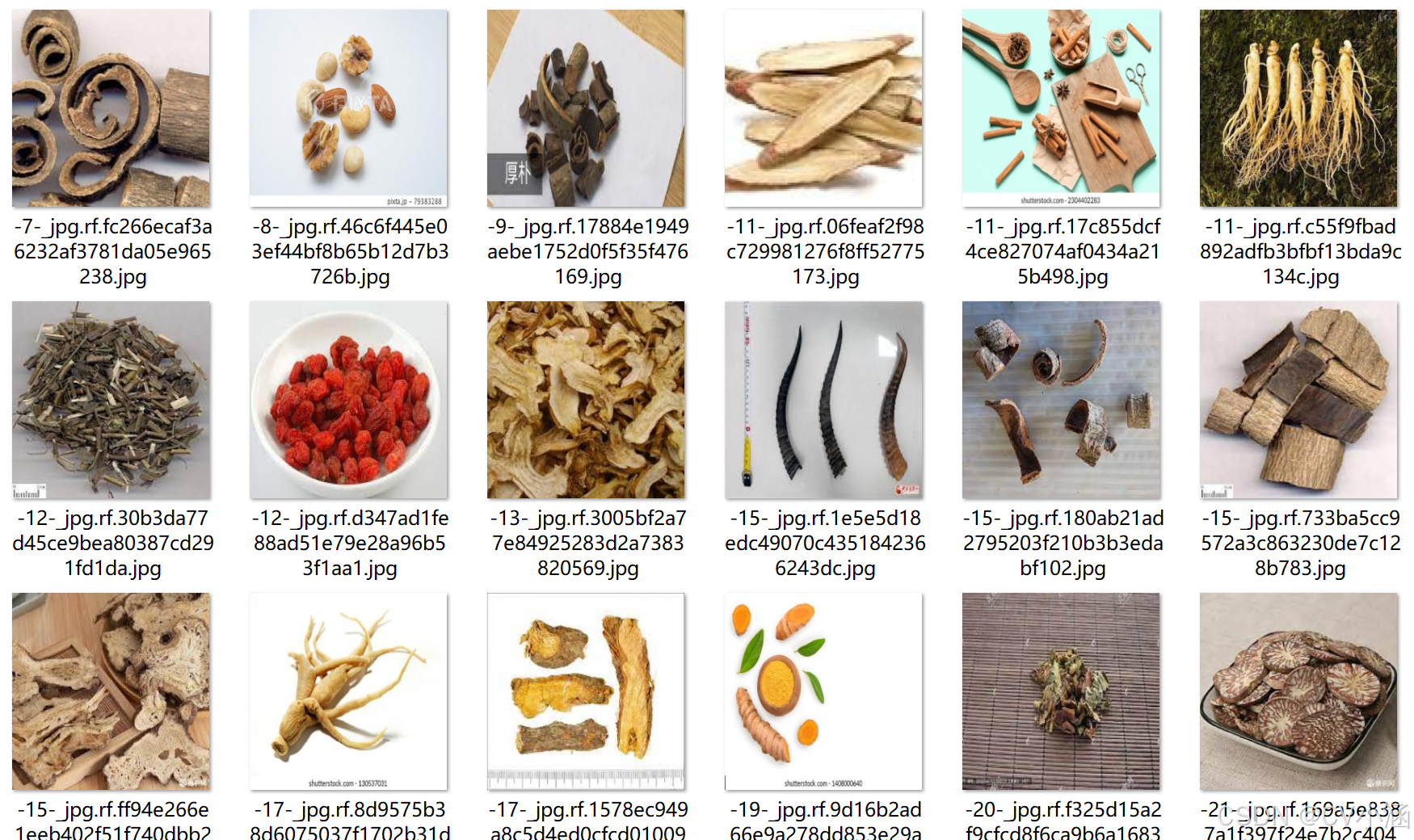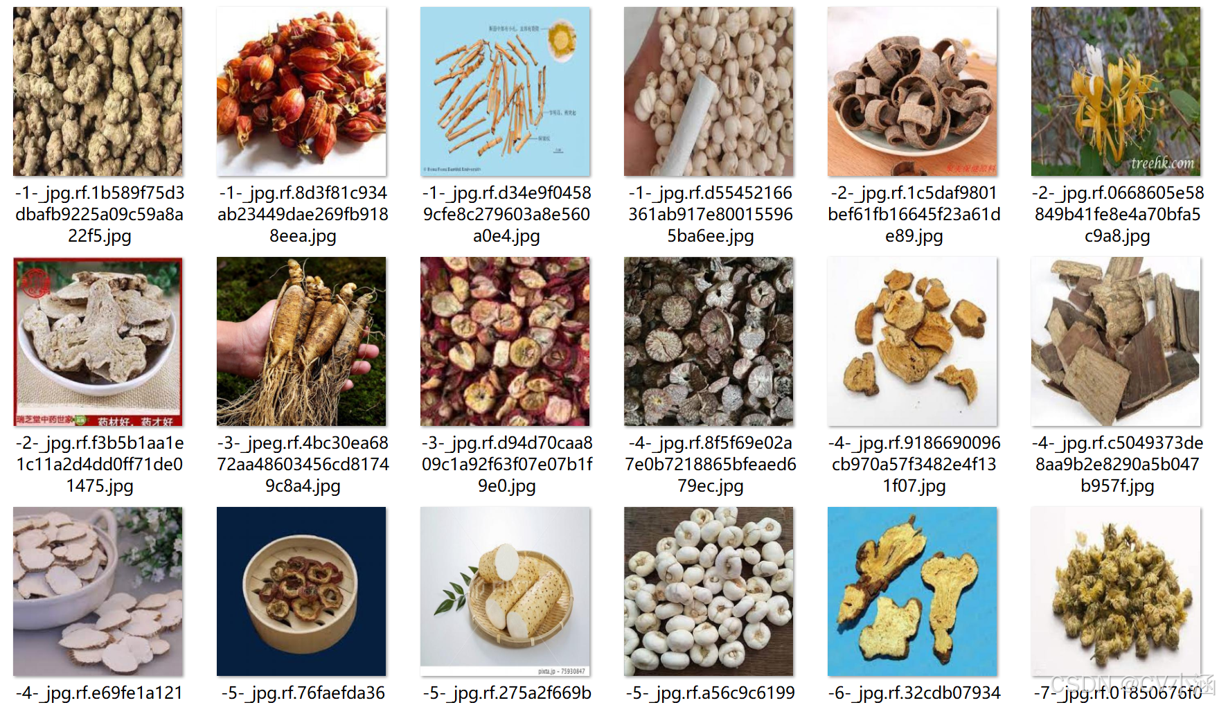 数据集中标签包含50种分类 :names = ['ginseng', 'Leech', 'JujubaeFructus', 'LiliiBulbus', 'CoptidisRhizoma', 'MumeFructus', 'MagnoliaBark', 'Oyster', 'Seahorse', 'Luohanguo', 'GlycyrrhizaUralensis', 'Sanqi', 'TetrapanacisMedulla', 'CoicisSemen', 'LyciiFructus', 'TruestarAnise', 'ClamShell', 'Chuanxiong', 'Garlic', 'GinkgoBiloba', 'ChrysanthemiFlos', 'AtractylodesMacrocephala', 'JuglandisSemen', 'TallGastrodiae', 'TrionycisCarapax', 'AngelicaRoot', 'Hawthorn', 'CrociStigma', 'SerpentisPeriostracum', 'EucommiaBark', 'ImperataeRhizoma', 'LoniceraJaponica', 'Zhizi', 'Scorpion', 'HouttuyniaeHerba', 'EupolyphagaSinensis', 'OroxylumIndicum', 'CurcumaLonga', 'NelumbinisPlumula', 'ArecaeSemen', 'Scolopendra', 'MoriFructus', 'FritillariaeCirrhosaeBulbus', 'DioscoreaeRhizoma', 'CicadaePeriostracum', 'PiperCubeba', 'BupleuriRadix', 'AntelopeHom', 'Pangdahai', 'NelumbinisSemen'],代表人参,水蛭,大枣,百合,黄连,乌梅,厚朴,牡蛎,海马,罗汉果,甘草,三七,通草,薏苡仁,枸杞子,八角茴香,蛤壳,川芎,大蒜,银杏叶,菊花,白术,核桃仁,天麻,鳖甲,当归,山楂,西红花,蛇蜕,杜仲,白茅根,金银花,栀子,全蝎,鱼腥草,土鳖虫,木蝴蝶,姜黄,莲子心,槟榔,蜈蚣,桑葚,川贝母,山药,蝉蜕,荜澄茄,柴胡,羚羊角,胖大海,莲子。