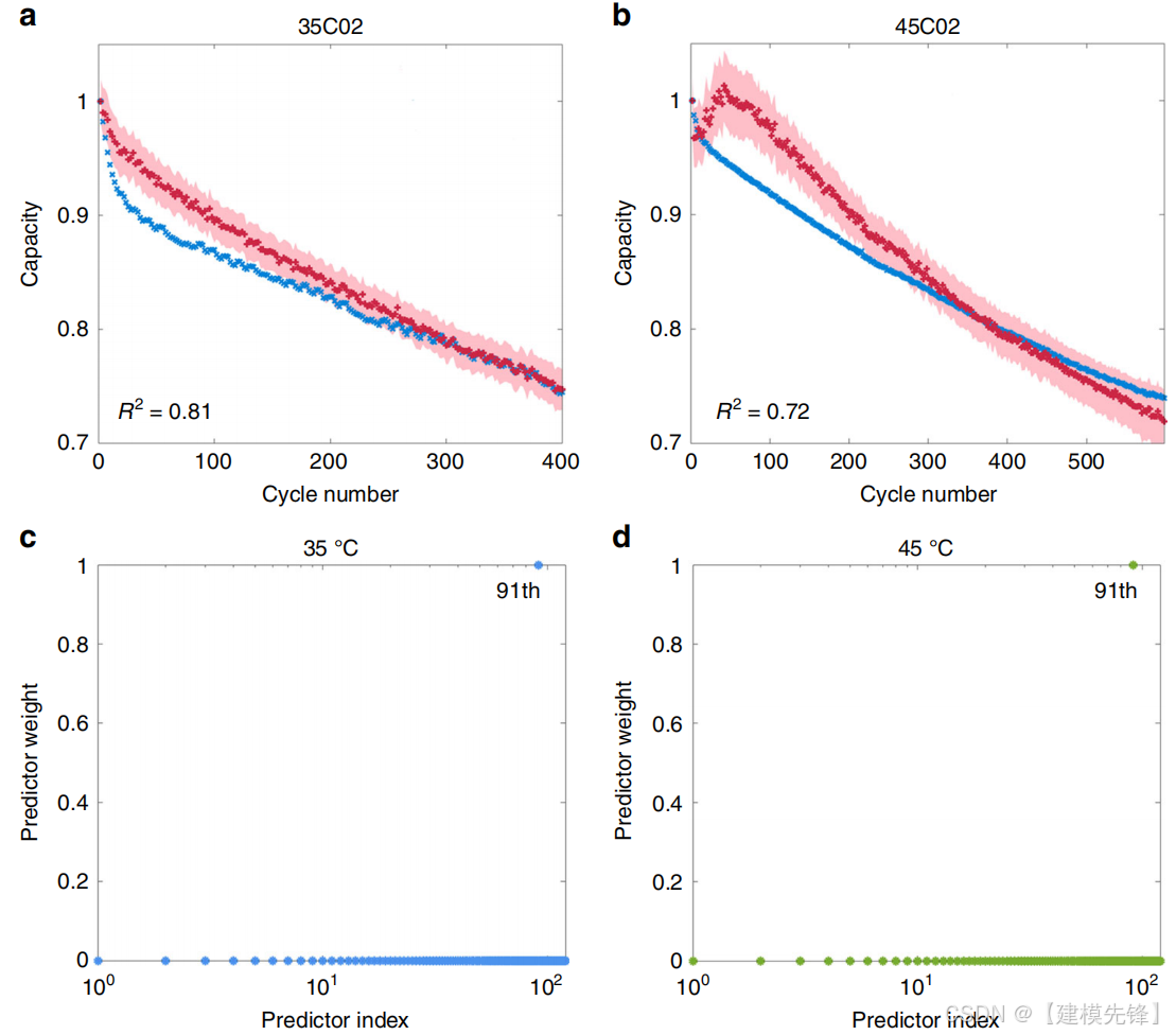 为了探索显著频率随不同温度的变化,我们将ARD方法应用于35°C和45°C的EIS容量探地雷达模型。图3c,d显示了这两个模型的ARD重要性权重。同样,每个模型都发现只有一个显著频率足以估计容量。选定的频率17.80赫兹位于低频区域,这与上一节中讨论的观测结果一致。