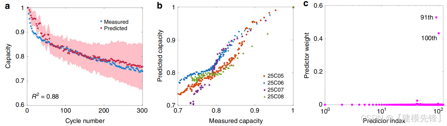 机器学习的最新进展表明,人们可以将整个数据集作为输入输入到模型中,而不需要手动挑选特征,并让模型选择最相关的变量。这些模型是为退化诊断而开发的,例如使用高斯过程模型预测未来的容量33、34和电荷状态(SoC)17,并使用正则化的线性模型预测循环寿命18。然而,这些模型都是以充放电曲线作为输入来开发的。任何模型的能力都受到输入信息含量的限制,用早期寿命数据预测电池的后期行为--这是最相关的问题--仍然是一个重大挑战。