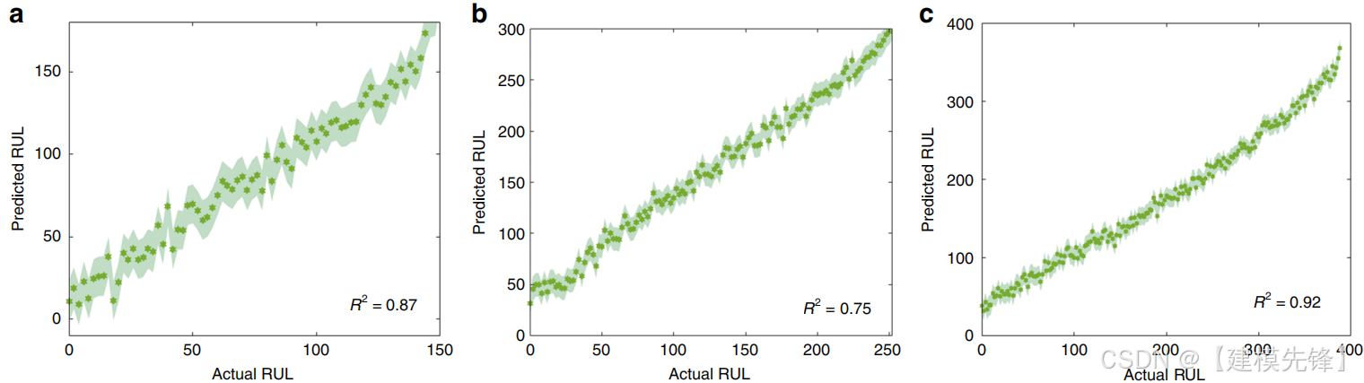 遵循同样的思路,我们还建立了用于RUL预测的多温度模型。我们的EIS-RUL模型能够准确地预测在三种不同温度下循环的细胞的RUL(图4)。
