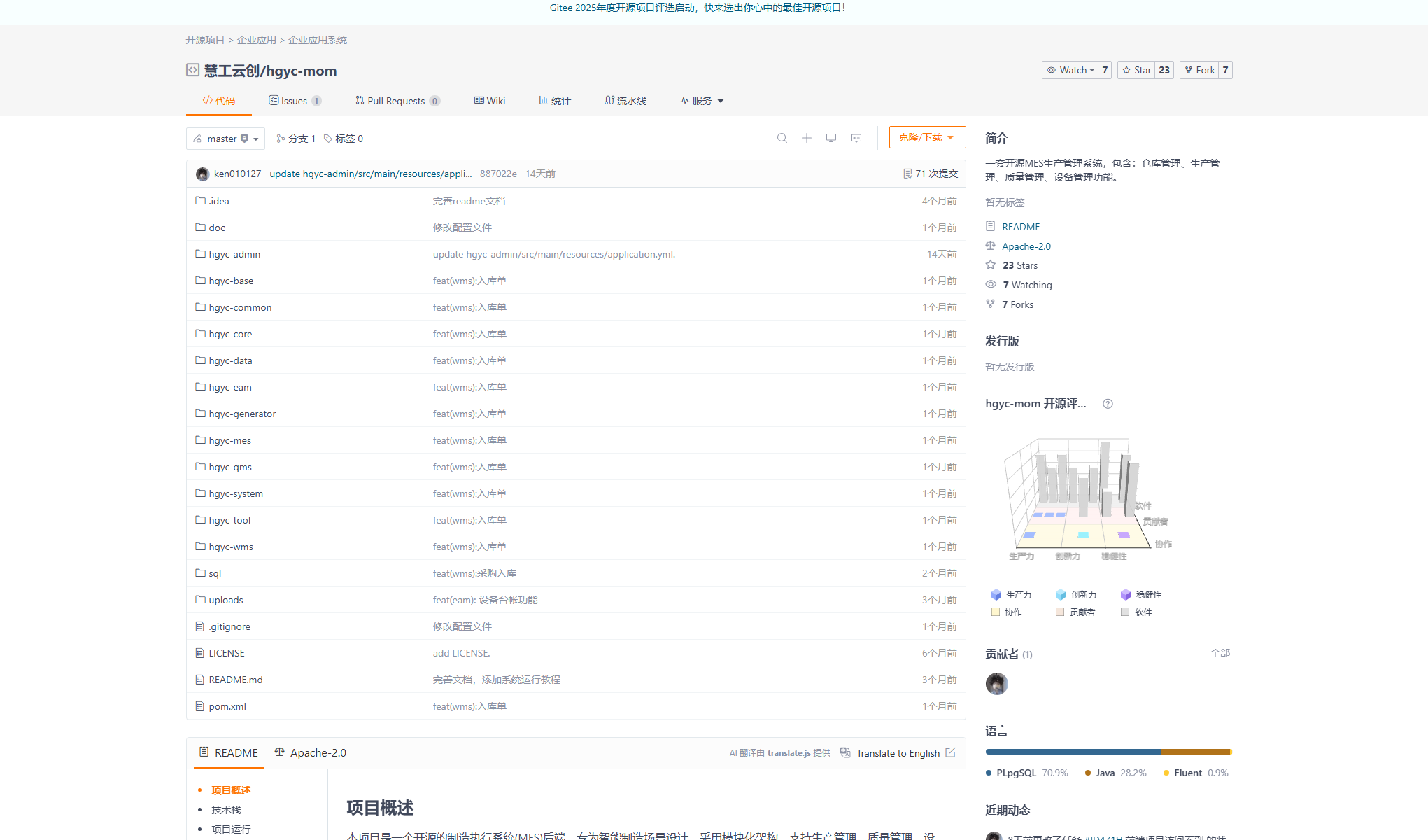 项目描述:一套开源的生产执行系统(MES),涵盖仓库管理、生产流程监控、质量管理以及设备管理等功能模块。
