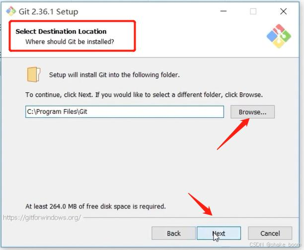 这里是安装路径的设置,点击"Browse"选择想要安装git的地方(也可以用默认地址),然后点击"next"下一步。