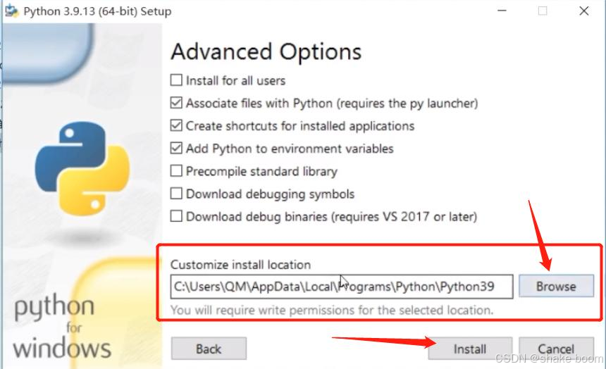 在这个界面选择安装python的路径(也可以用默认地址),点击"Browse"浏览选择路径,然后点击"install"开始下载。