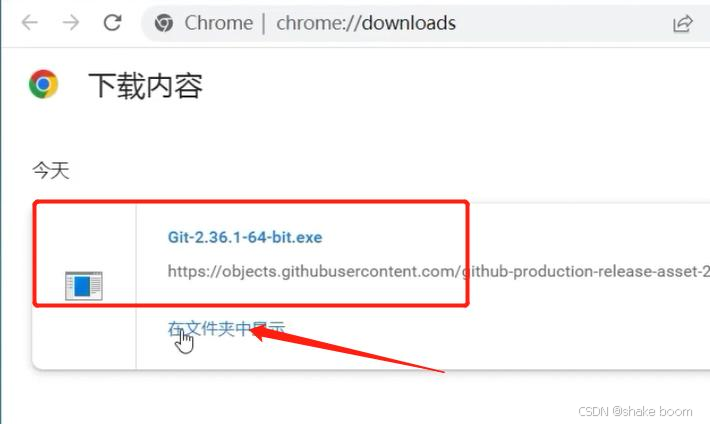 下载好后,点击"在文件夹中显示",在弹出的文件夹中找到"git安装程序",选择"以管理员身份运行"。