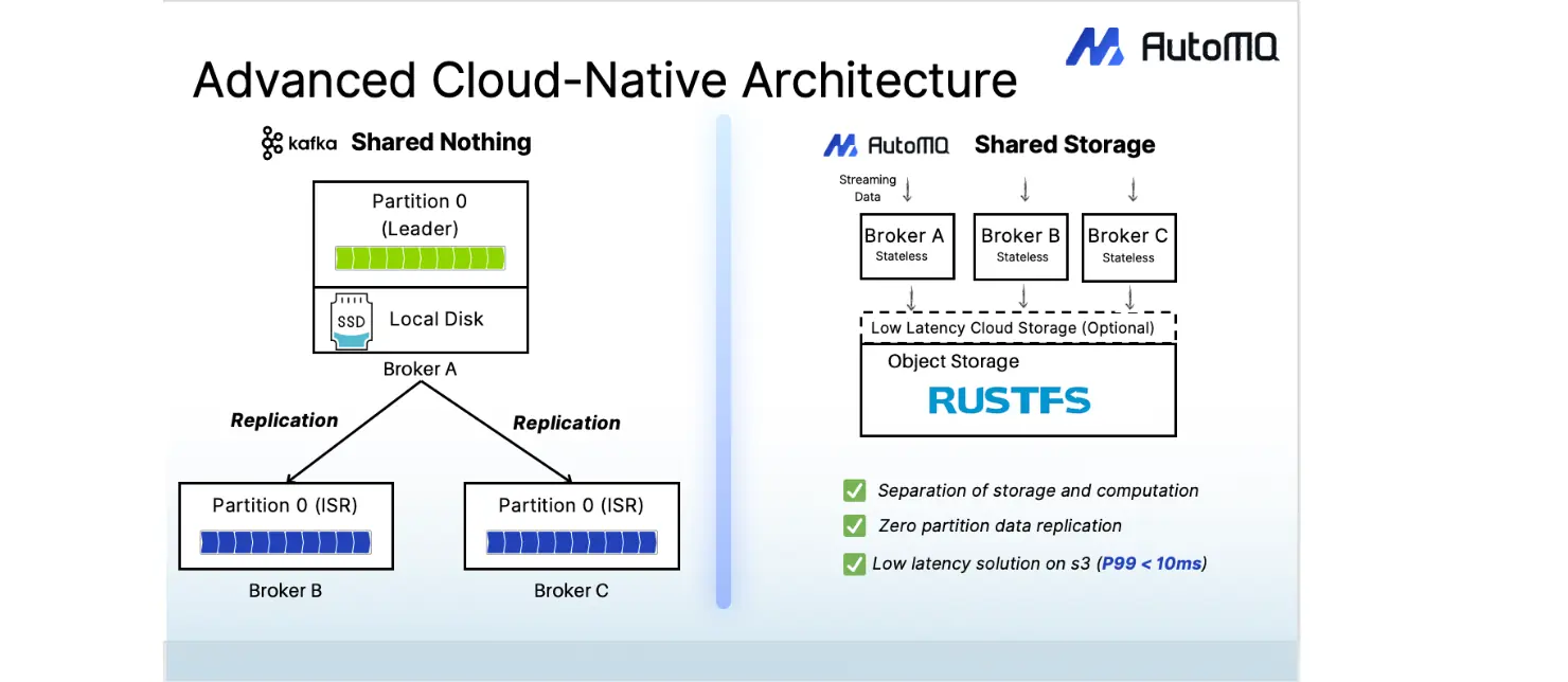 - Extreme Cost Optimization : AutoMQ, with its compute-storage separation architecture, can save up to 90% on Kafka TCO and, through multi-point read/write architecture optimization, completely avoids expensive cross-Availability Zone (AZ) traffic. RustFS's lightweight architecture has low hardware requirements, and combined with the Apache 2.0 friendly license, further reduces storage and software licensing costs.