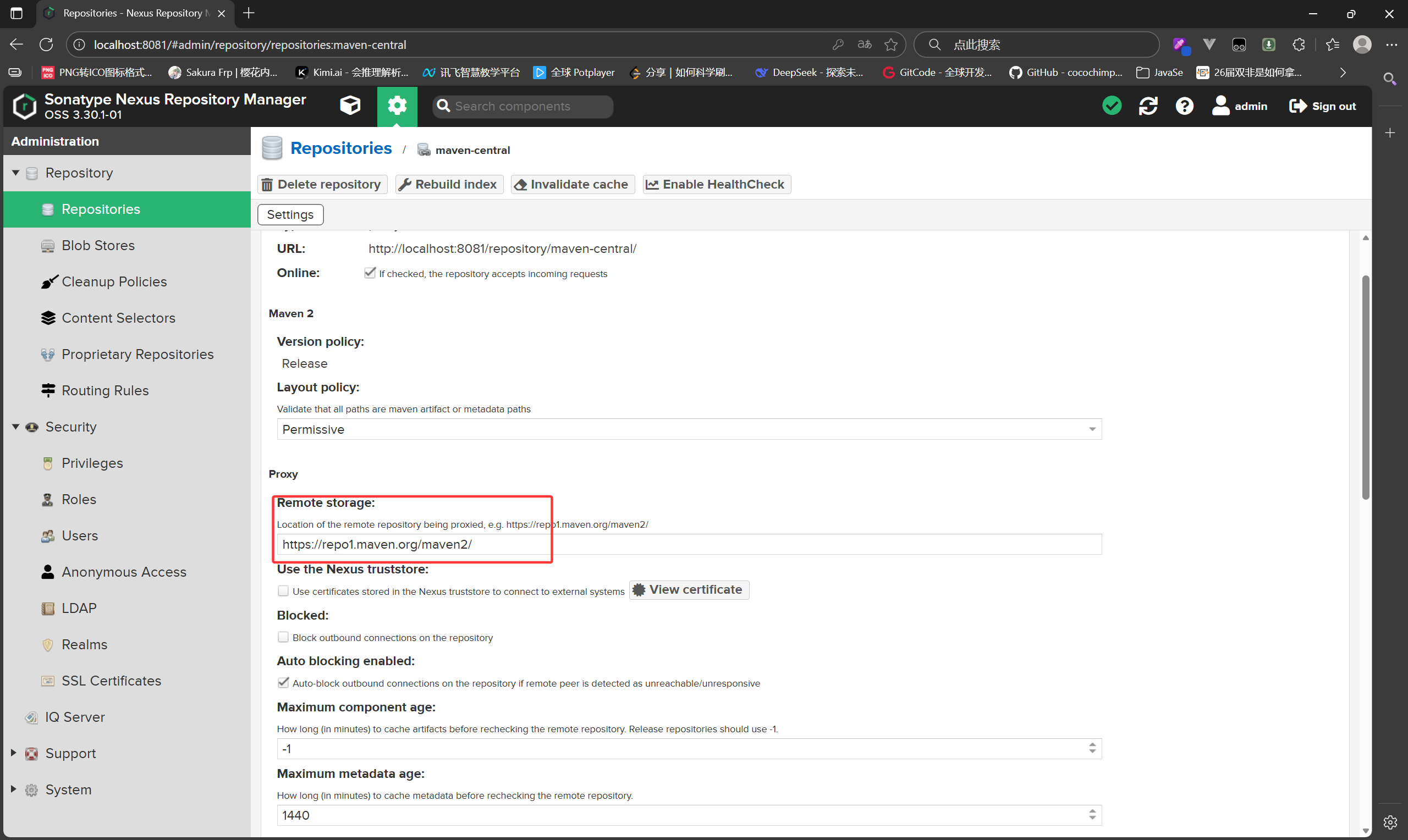 - 代理远程仓库,通过nexus访问其他公共仓库,例如中央仓库