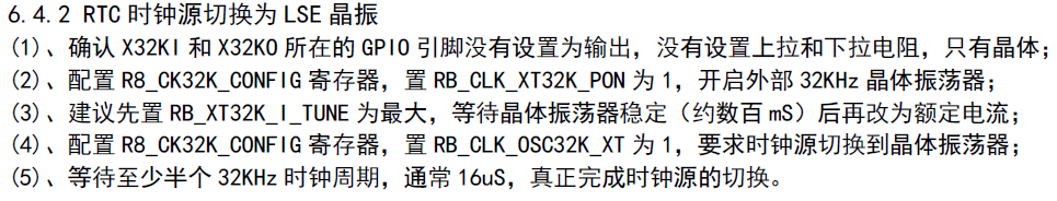 R8_CK32K_CONFIG |= RB_CLK_OSC32K_XT | RB_CLK_XT32K_PON; // 使能外部32.768kHz晶振和外部晶振上电