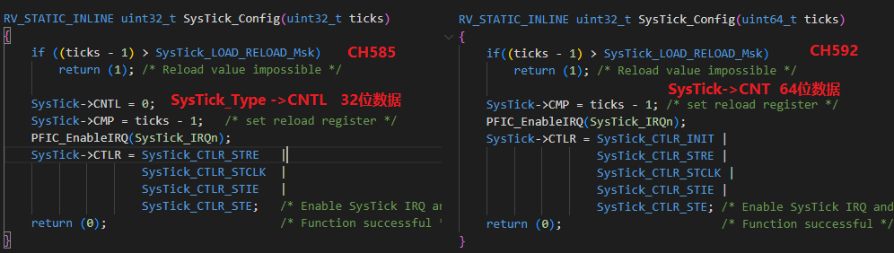使用方式和 CH585 是一样的,只是在SysTick_Config 实现上有细节上的不同: