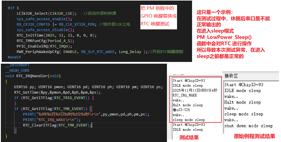 说明一下,上面前面两种低功耗模式正常唤醒,sleep 模式会操作 RTC ,导致了异常,大家可以自行查看PM_LowPower_Sleep 函数实现,这里不过多深入讨论,如果后期确实遇到问题,我们再来详细探讨。