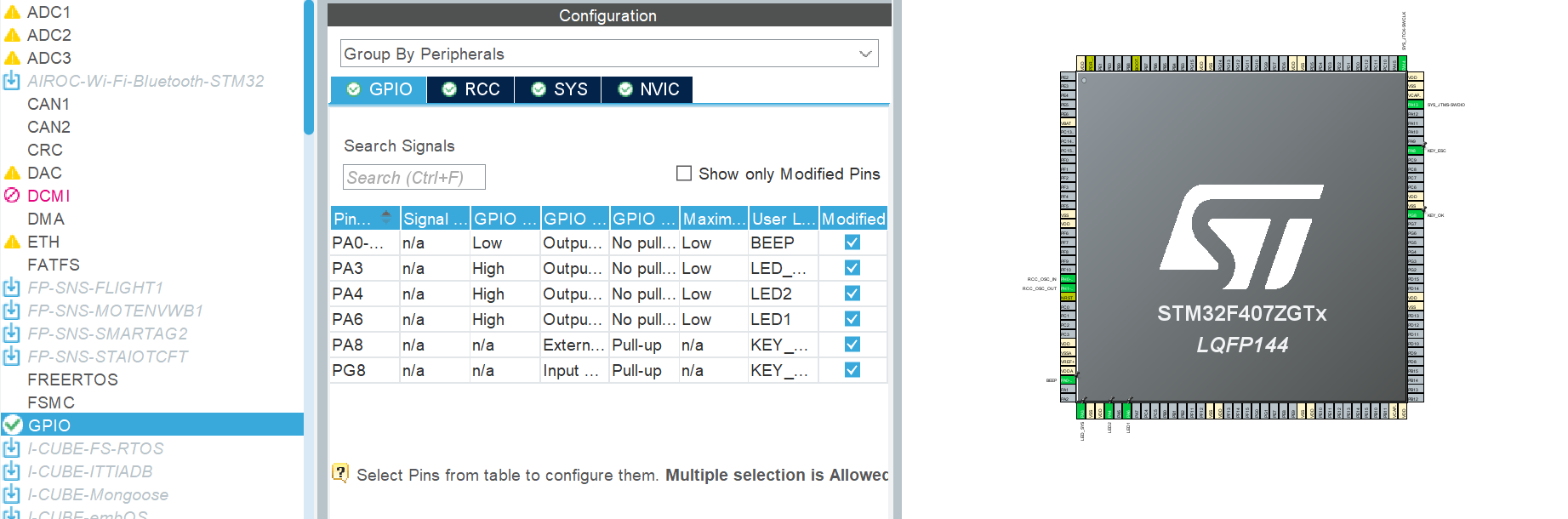 这三个外设就是对F407的GPIO口的基本使用,通过GPIO口电平的输出输入来控制和获取外设信息。我们可以直接将F103的程序移植过来,只需要在CubeMX中更改相应的引脚即可。这也就是HAL库比标准库可移植性更好的一个体现,因为其底层帮助我们进行啦对应的宏定义和初始化配置等。CubeMX的配置如下: