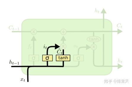 记忆门是用来控制是否将在 𝑡时刻(现在)的数据并入单元状态中的控制单位。首先,用tanh函数层将现在的向量中的有效信息提取出来,然后使用(图上tanh函数层左侧)的sigmoid函数来控制这些记忆要放"多少"进入单元状态。这两者结合起来就可以做到: