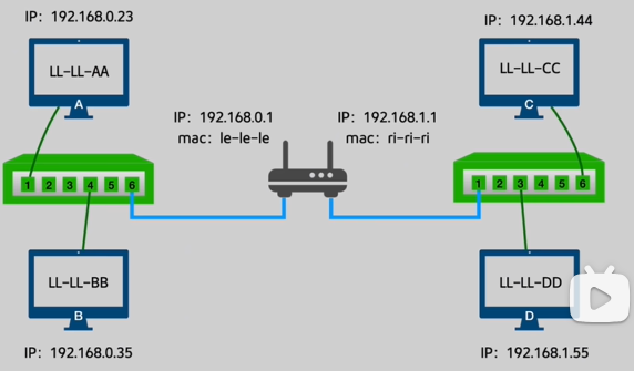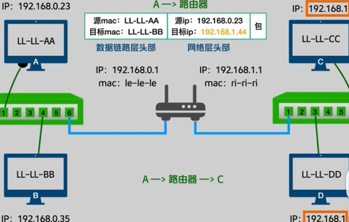 A要给C,过程中先给到路由器,所以数据链路层的目标mac要是路由器的mac地址,网络层的ip必须是A的ip到C的ip。