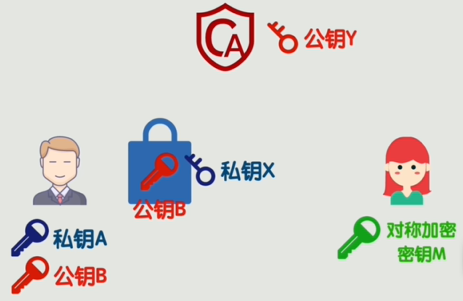 为了防止公钥B被篡改,可以把公钥B交给可信的第三方CA,第三方用自己的私钥X加密,就是做了一个数字签名。发送方再把数字签名和公钥B发给接收方,接收方通过第三方的公钥Y解密,可以拿到公钥B,也可以和发送方的公钥B进行对比,查看是否被篡改。如果被篡改,则拒绝后续交互。