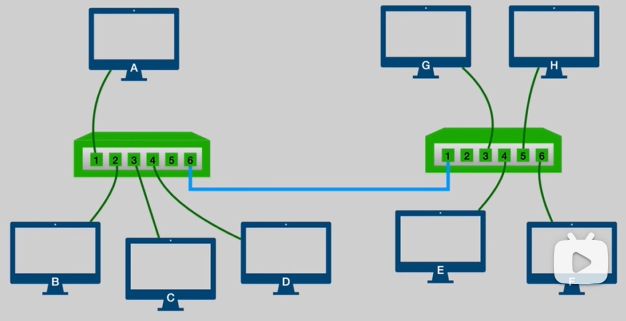 这基本就是现在常用的单交换机的形式,但是交换机的端口也不够用了怎么办呢?于是就有了多个交换机之间的通信。