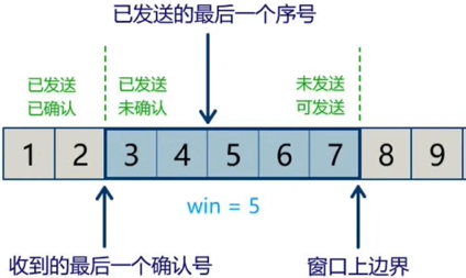 假如B给A传回来的窗口大小为5,当A不断发送数据包时,已发送的最后一个序号就往右边移动,直到碰见了窗口的上边界,此时A就无法继续发包,达到了流量控制。在A发包的同时,A也会不断收到来自B的确认包,此时整个窗口就会往后移动,因此上边界也往右移动,A就能发更多的数据包了。