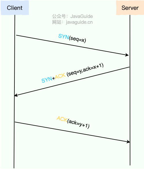 第三次握手 (ACK) : 客户端收到服务端的 SYN+ACK 报文段后,会向服务端发送一个最终的确认报文段。该报文段包含确认号 ack=y+1。发送后,客户端进入 ESTABLISHED 状态。服务端收到这个 ACK 报文段后,也进入 ESTABLISHED 状态。