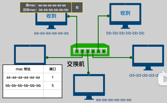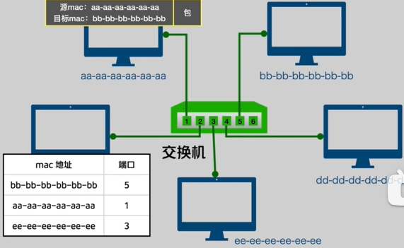 交换机内部维护着一张mac地址表,记录了每个设备的mac地址和对应的交换机端口号。包在传递的时候就会根据包信息,将包数据传输给对应的端口。