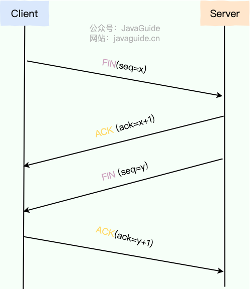 - 第三次挥手 (FIN) :当服务端确认所有待发送的数据都已发送完毕后,它也会向客户端发送一个 FIN 报文段,表示自己也准备关闭连接。该报文段同样包含一个序列号 seq=y。发送后,服务端进入 LAST-ACK 状态,等待客户端的最终确认。