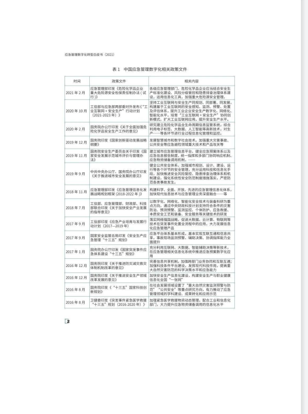 白皮书开篇就明确了应急管理数字化的政策基调 ------ 这是落实 "平安中国" 战略、推进国家治理能力现代化的核心举措。梳理白皮书收录的 2016-2021 年政策文件(对应白皮书表 1,附件 1),能清晰看到政策演进路径: