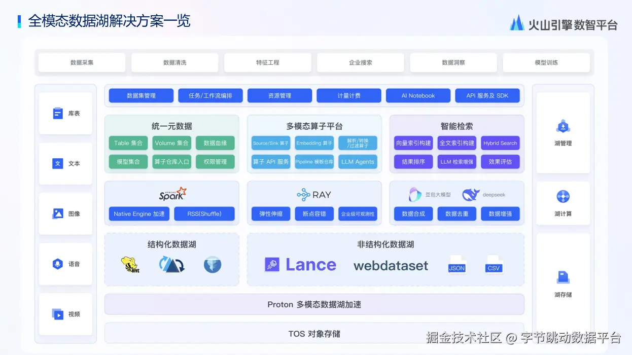 该能力基座采用开放性架构,聚焦六大关键维度:开箱即用特性、开源兼容性、轻量运维、成本优化、极致性能和AI原生设计。在存储层,方案引入Lance数据湖格式替代传统Parquet,通过列式压缩技术降低30%存储空间,并借助强化元数据描述与高级索引实现多模态数据秒级检索,内置版本管理功能显著提升非结构化数据管理效率。计算层深度整合Spark/Flink大数据栈与Ray/Daft等Python生态框架,通过EMR Ray的分布式并行化能力将算法团队改造成本最小化,在自动化标注场景中已验证可提升GPU利用率20%以上。