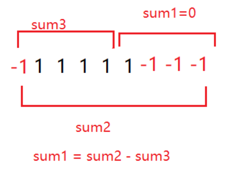 结论:如果两个前缀和相等,那么它们之间的子数组和就是 0 → 0 和 1 数量相等!