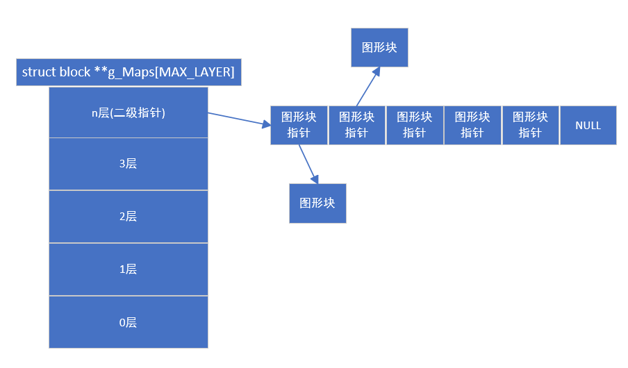 使用一个全局二级指针数组指向所有的单层图形块指针数组表示全局地图。