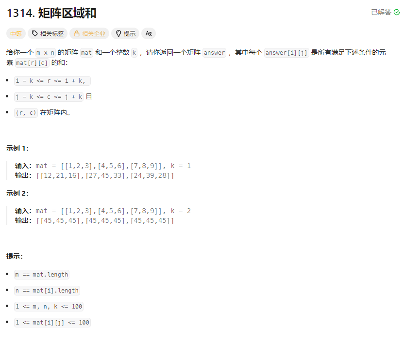 根据题目要求:我们是求 i 和 j 在 i - k <= r <= i + k,j - k <= c <= j + k 的区域和。