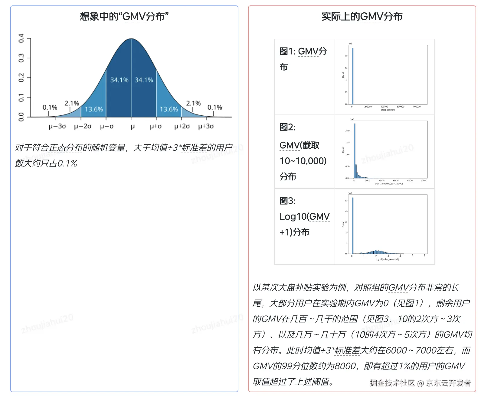 这个范围,那么就属于异常值。但这个标准通常假设了样本的分布属于正态分布或者近似正态分布,对于互联网公司的幂律分布指标适用性较差,我相信大家都能感受到"JD大盘Top1%的用户成单GMV都是异常值"这个结论有多么的离谱。