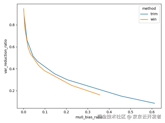 •但如果我们忽略掉具体的分位数选择,直接对比方法的损失(横轴,均值估计偏差)与收益(纵轴,方差缩减效果),可以发现winsorize方法更具有优势,即在相同的均值估计偏差下,有更大的方差缩减效果(即下图中,左下角更好)。