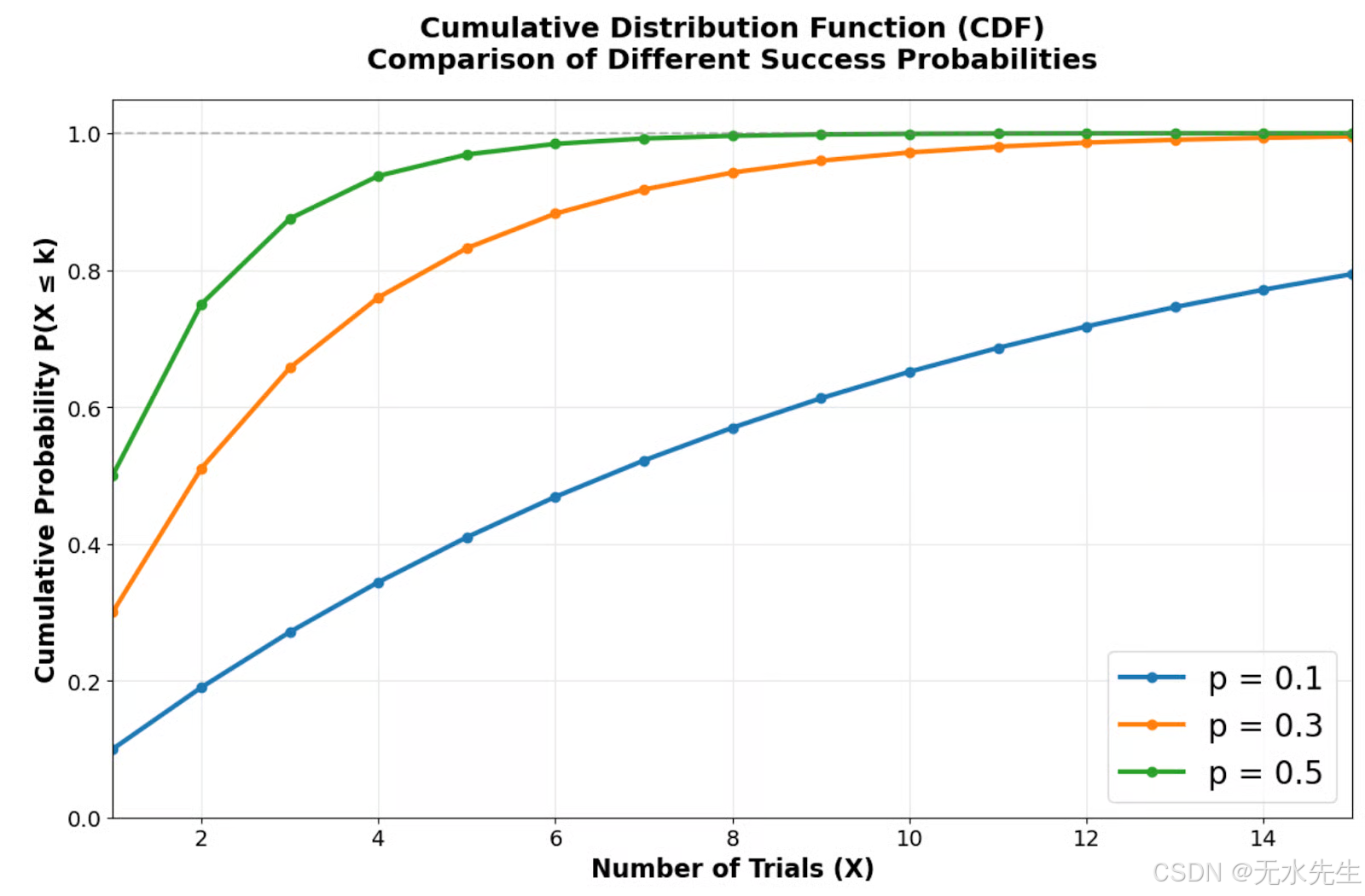 累积分布函数展示了几何分布趋近于确定性的速度。较高的成功概率会产生更陡峭的曲线,只需几次试验即可达到较高的累积概率。例如,当 p = 0.5 时,前两次试验的成功概率约为 75%;而当 p = 0.1 时,则需要更多的试验才能达到相同的确定性水平。