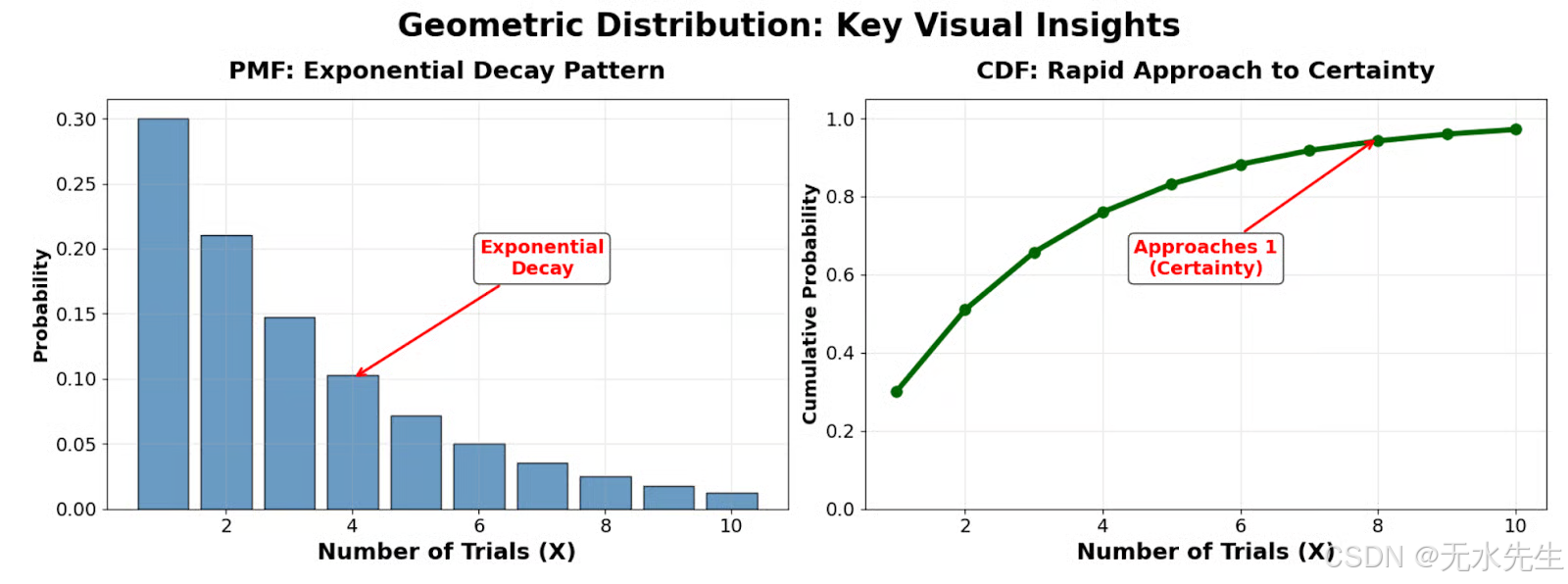 这段代码创建了一个聚焦式可视化图,重点突出几何分布的两个最重要的视觉特征。左侧面板展示了概率如何从第一次试验开始呈指数衰减,而右侧面板则展示了累积分布函数 (CDF) 中概率质量的快速累积。