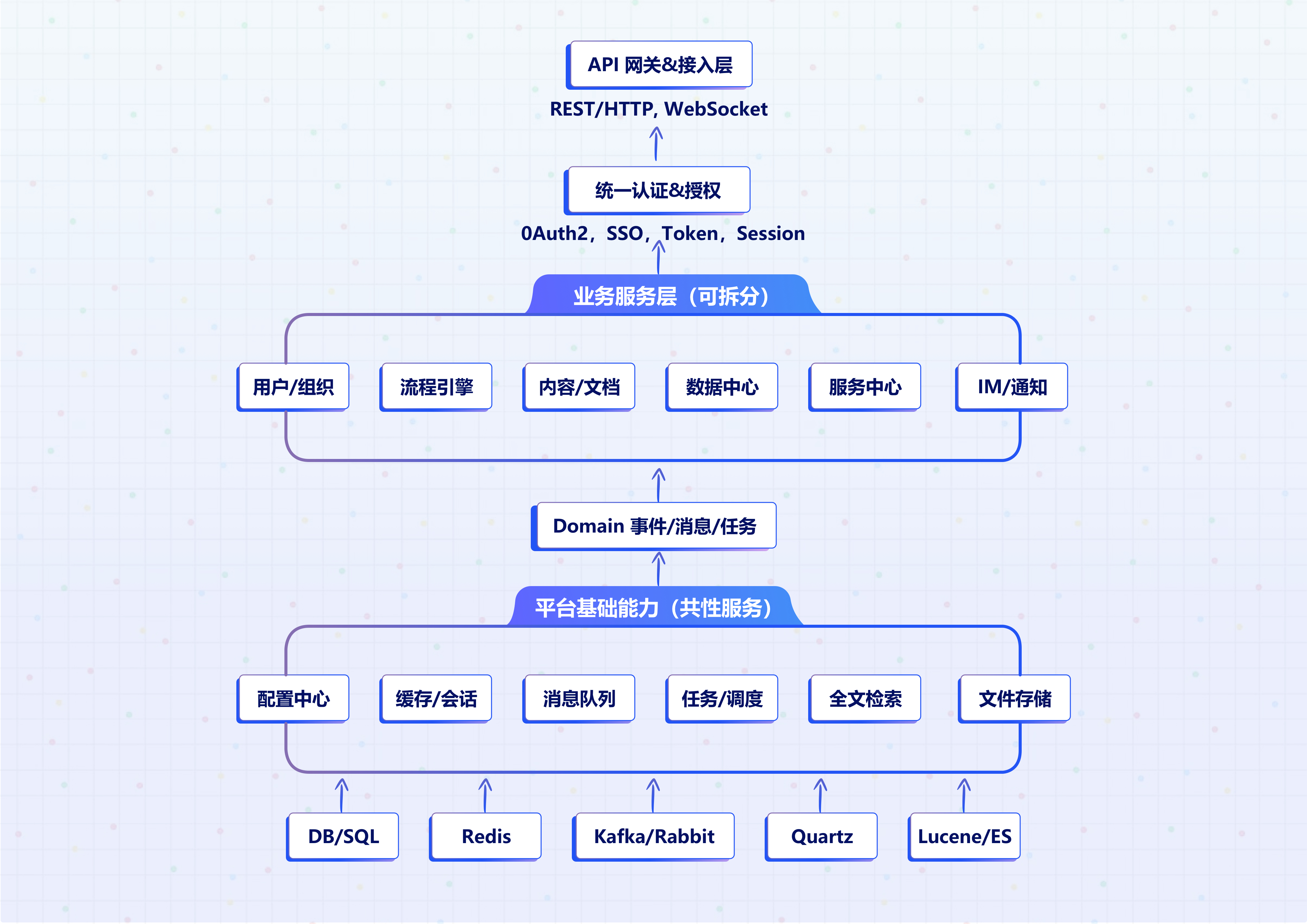 - 业务服务层:涵盖用户 / 组织、流程引擎、内容文档、数据中心、IM / 通知等可拆分模块。