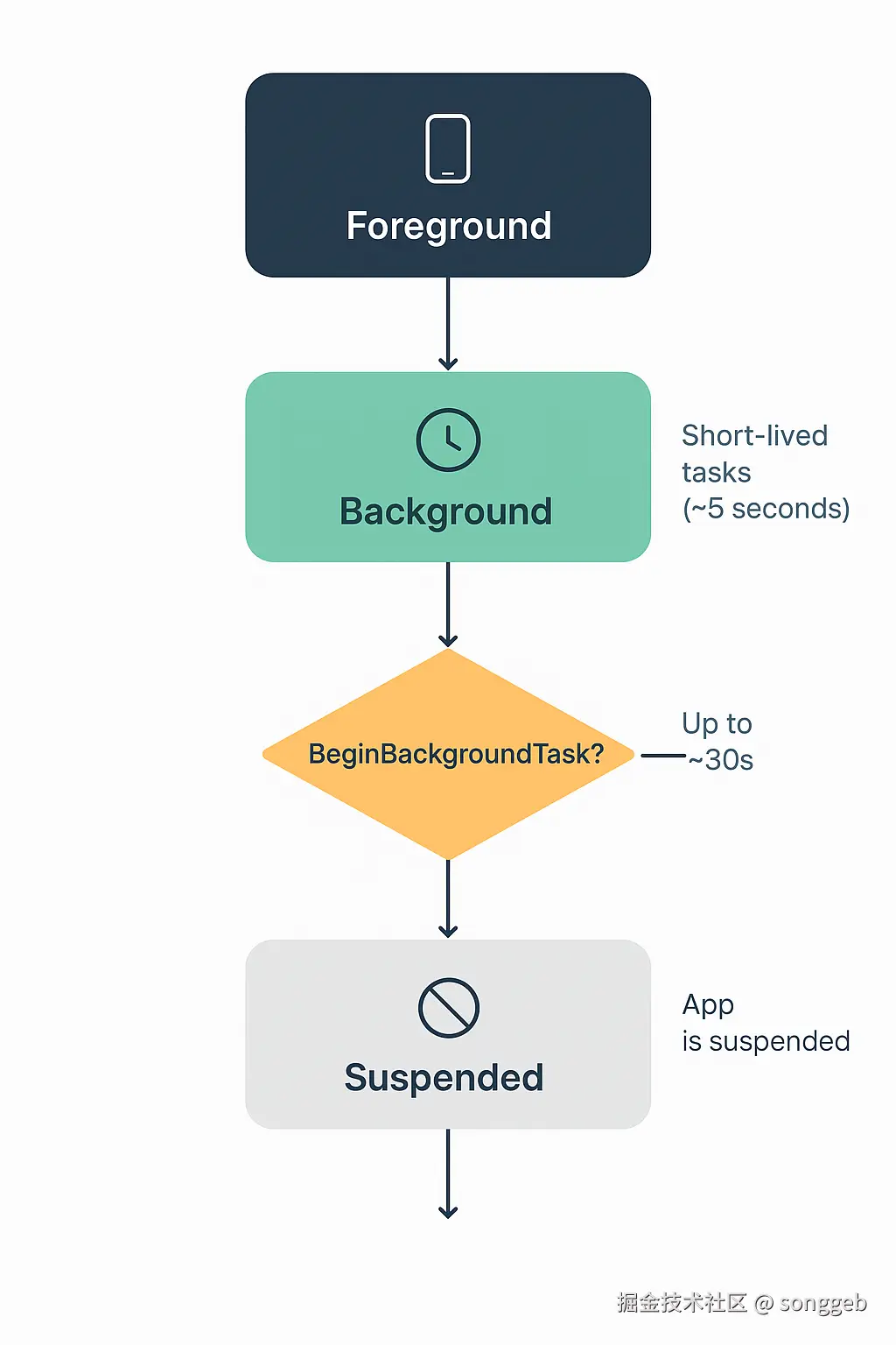 applicationDidEnterBackground会执行,同时进入Background状态,该方法会有5s时间执行其中的任务 applicationDidEnterBackground之后,如果没有beginBackgroundTask发起的后台任务,则很快就会进入Suspended状态- 进入