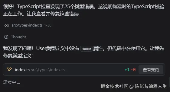 最让人惊叹的还是,对 Typescript 的修复。虽然 Typescript 错误有25个,但修复过程中仅仅被 Trae 中断了一次。