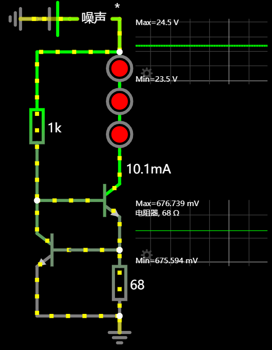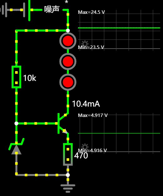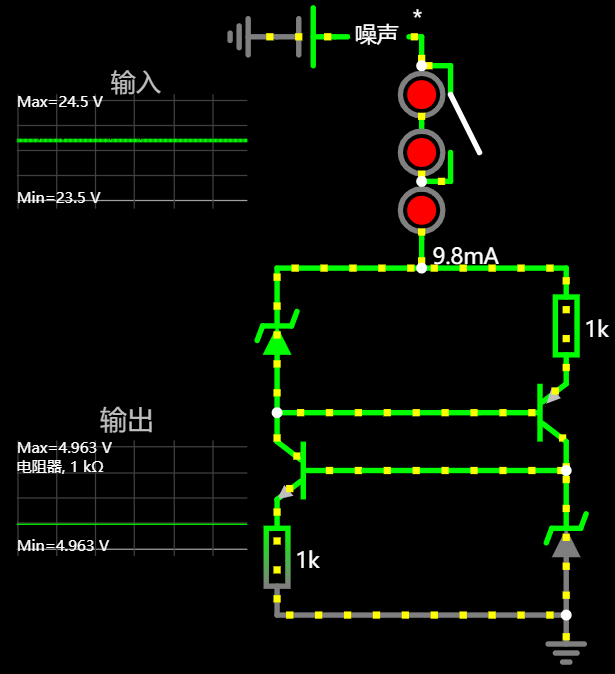 ✅ 在输入电压波动(23.5V ~ 24.5V)且存在噪声的情况下,提供一个稳定输出为 10mA 的电流。