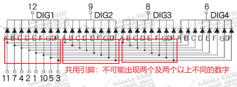 结构 :所有 LED 的「阴极」连在一起作为公共端(COM),公共端接 GND(电源负极)。