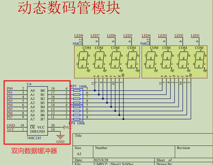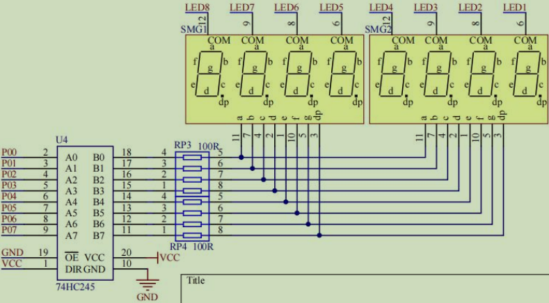 下图模块电路中,74HC138 连接数码管位选,74HC245 连接数码管段选
