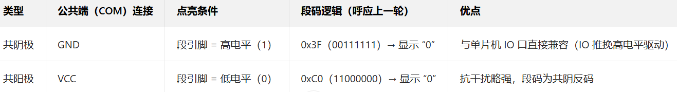 结构 :所有 LED 的「阳极」连在一起作为公共端(COM),公共端接 VCC(电源正极)。