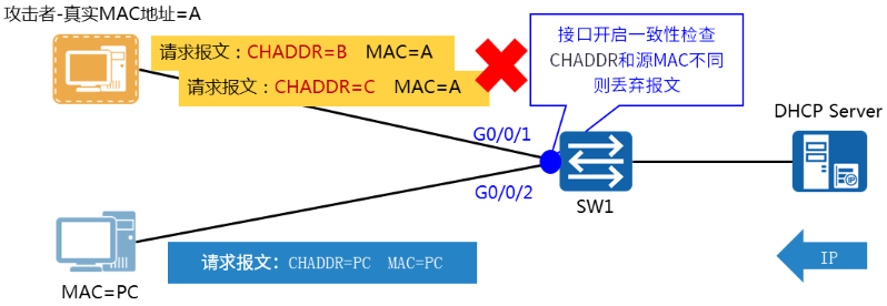 [SW1-G0/0/1]dhcp snooping check dhcp-chaddr enable //接口下开启一致性检查