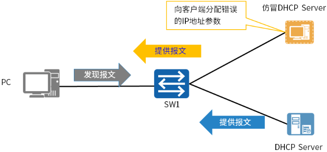 √ 客户端以广播方式发送Discover-发现报文,仿冒DHCP服务器和合法的DHCP服务器都能收到该报文,且都会回复Offer-提供报文
