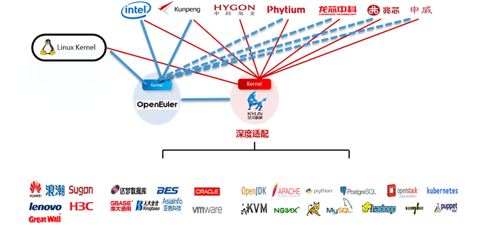 麒麟V10是一款商业版本服务器操作系统,其作为承载业务系统的基础底座,能满足大部分企业的产品需求,各类软硬件适配也都较好。麒麟V10的SP1/SP2/SP3版本内核都是基于OpenEuler 20.03 LTS研发的,其支持X86、ARM、Alpha、MPIS等CPU架构,支持Intel、AMD、鲲鹏、海光、飞腾、龙芯、兆芯、申威8种国内外主流CPU品牌,已适配1400多款国内外服务器整机,适配1500多款主板和板卡,适配200多款数据库和200多款中间件产品,适配6600多款服务器基础软件,适配250000多款服务器商业软件和开源软件。
