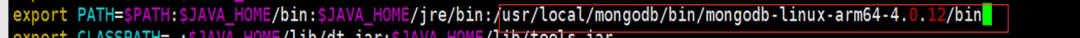 export PATH=$PATH:/usr/local/mongodb/bin/mongodb-linux-arm64-4.0.12/bin