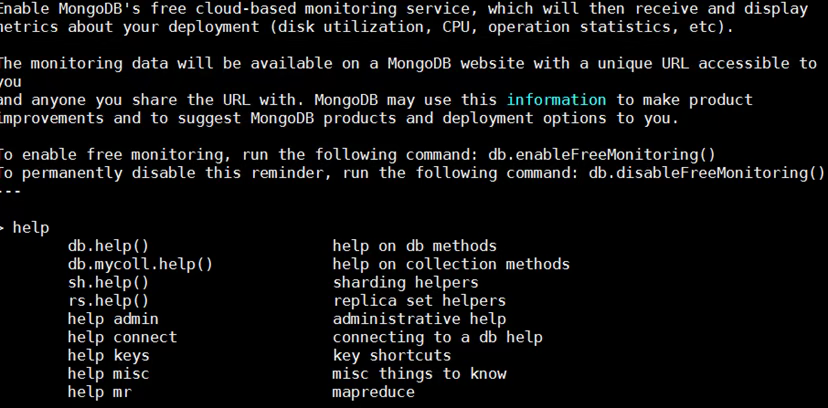 验证帮助、退出等功能"help"、"show dbs"、"quit"进行交互。