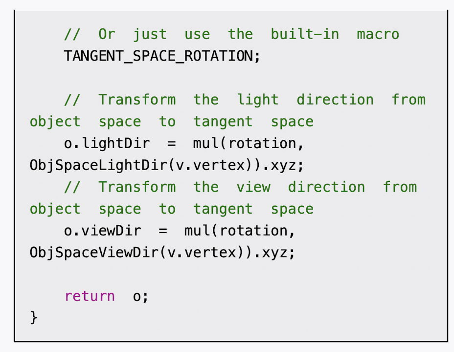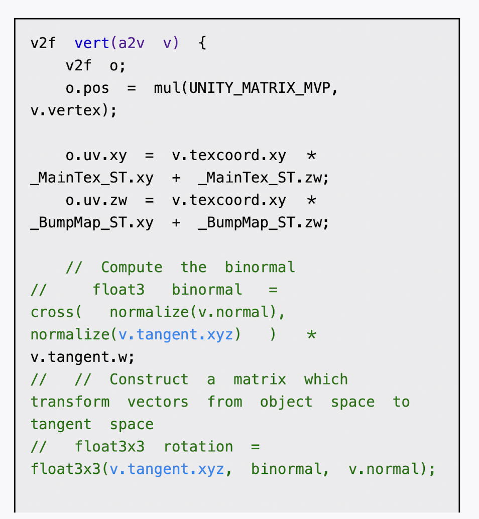 // Construct a matrix which transform vectors from object space to tangent space // float3x3 rotation = float3x3(v.tangent.xyz, binormal, v.normal);