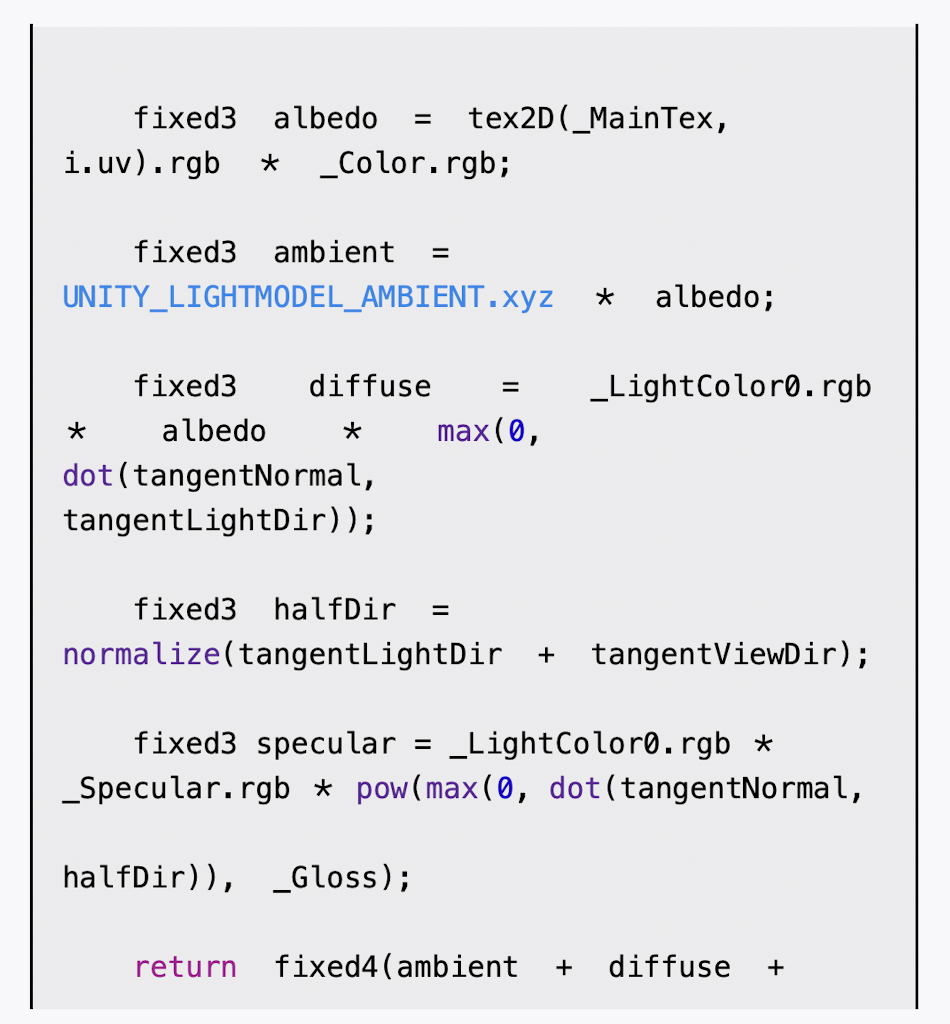 fixed3 ambient = UNITY_LIGHTMODEL_AMBIENT.xyz * albedo;