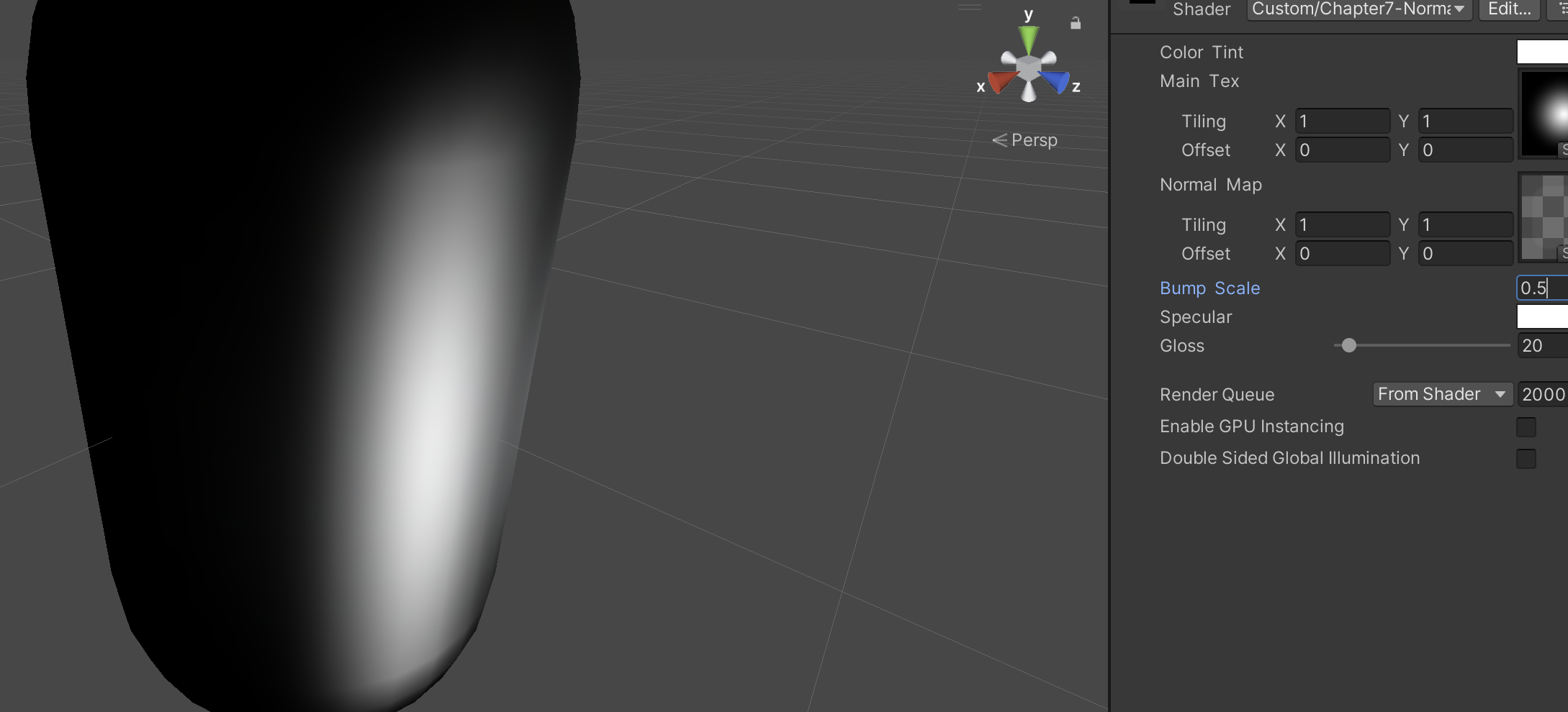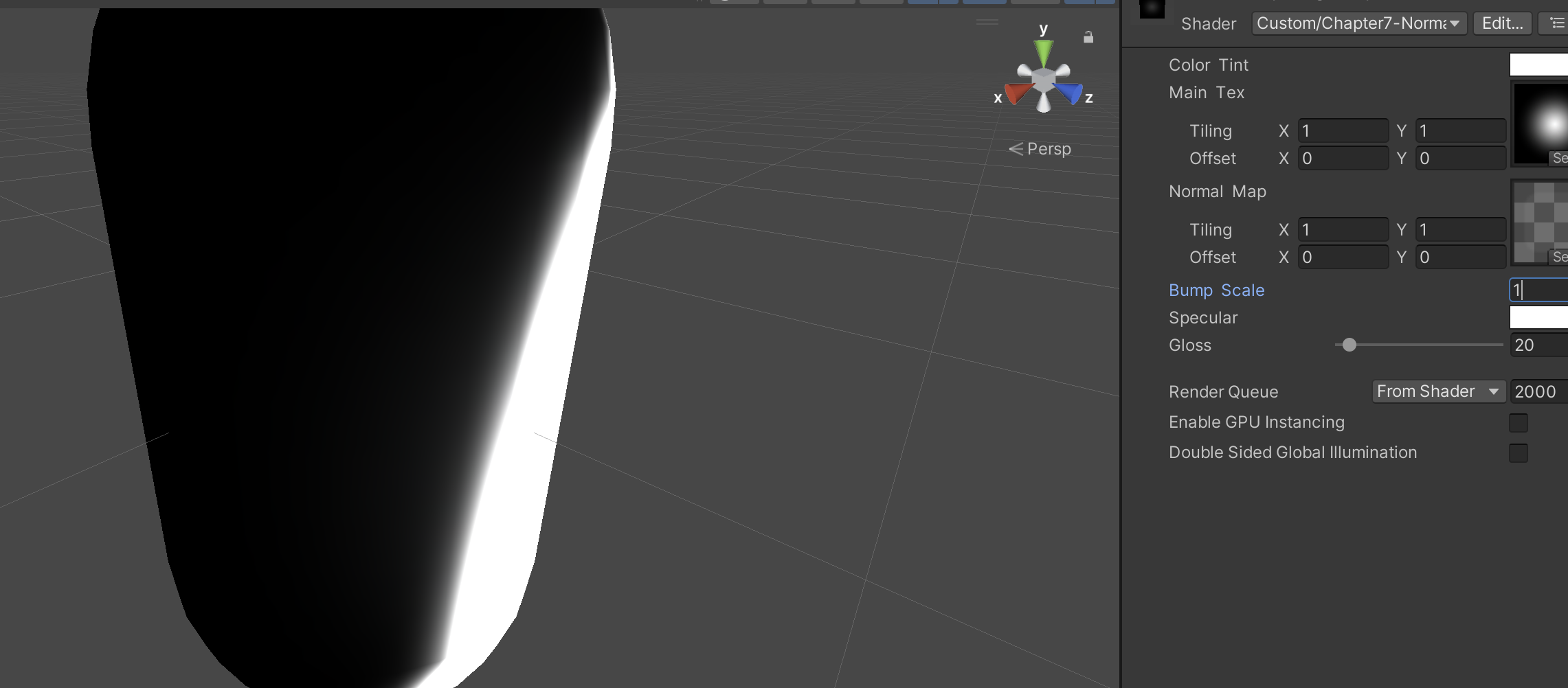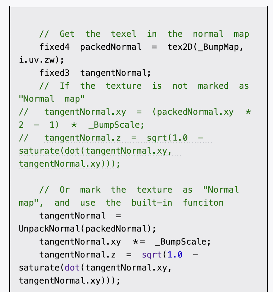 //tangentNormal.xy = (packedNormal.xy * 2 - 1) *_BumpScale; //把packedNormal的xy分量按之前提到的公式映射回法线方向,然后乘以_BumpScale(控制凹凸程度)来得到tangentNormal的xy分量