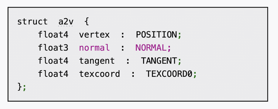 (7)我们已经知道,切线空间是由顶点法线和切线构建出的一个坐标空间,因此我们需要得到顶点的切线信息。为此,我们修改顶点着色器的输入结构体a2v: