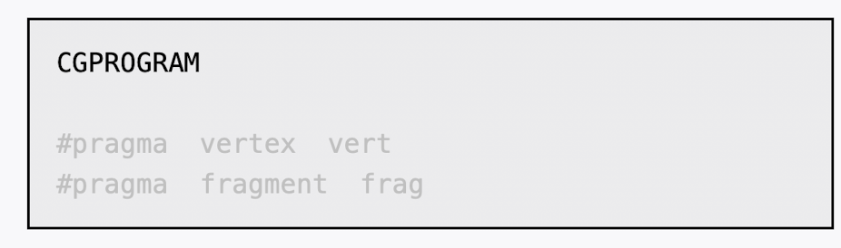 (4)接着,我们使用CGPROGRAM和ENDCG来包围住CG代码片,以定义最重要的顶点着色器和片元着色器代码。首先,我们使用#pragma指令来告诉Unity,我们定义的顶点着色器和片元着色器叫什么名字。在本例中,它们的名字分别是vert和frag: